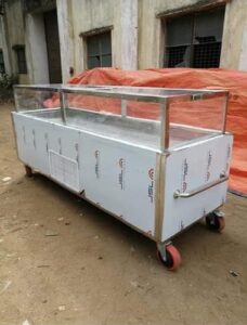 Mortuary Dead Body Freezer Box Details Outer body 202 finish 22 guage, Tank 304 finish 26 gauge, Top Dome made with clear 2 mm polycarbonate transparent sheet, with kirlosker Emerson Copeland compressor 1 year warranty , With 1 KV Stabilizer, on wheels (two with breaks) Dim : inner size 6.5 ft L x 22.5″ ft Width outer 85″ x 28″ x Total Height 36″ ( 4″ wheels+ 20 ” body + Dome height 12″ Price 45, 000 + 18% tax 8100 = 53,100=00 + 1000 Local Transportation separate For More Details Call 9866012211